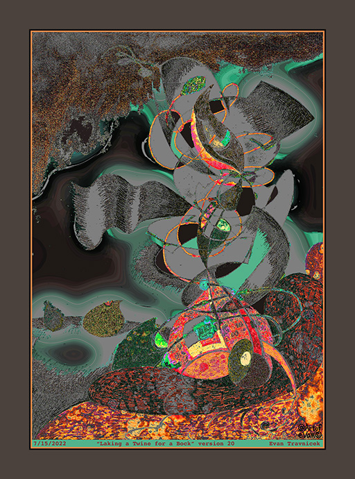 It’s titled Laking a Twine for a Bock. I changed some letters and words in the expression Paul Klee used “taking a line for a walk” when he summarized what he did when he made art. As I mentioned, this piece looks like its an abstract scape of an underground cavern, so there is what looks like a pool of molten lava in the foreground to me. The pool of molten lava associates with the word in the title “lake.” This image was derived from a physical drawing I made with pens, markers, and paint that had almost nothing to do with this current digital incarnation. That’s why this one is “version 20.” I made 19 prior versions.