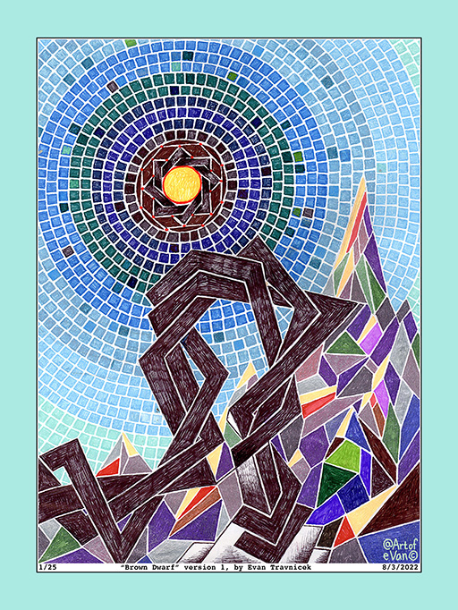 The overlapping squares make me think of frames, as in picture frames. Frames attempt to capture beauty, or a thing of interest, for an artist and his or her audiences. It’s like the light of this star is being bound by a limiting frame. I drew some parallelogram mosaic pieces surrounding the black frame holding the star bound in its place in the sky.