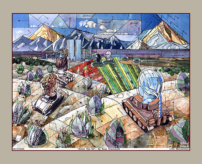 The title Event Too O2 associates with the historical Event 201, at which the world of western elites gathered together in 2019 to play out and discuss a hypothetical pandemic a year before the real pandemic took place. I feel that the confusion of conflating the pandemic with supposed manmade climate change, along with societal disparities among the different classes that politicians exploit with heart deceiving lies is sufficiently displayed here in this illustration with a kind of surrealistic madness as female heads on tanks (talking heads of the corporate media military industrial complex) battle it out as spectacles on manufactured landscapes for listeners and viewers to to come to conclusions approved of by the ruling classes.