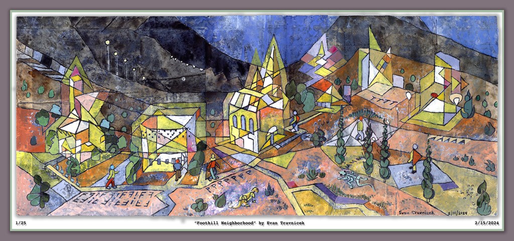I intentionally made a progression from light to dark with the lines dividing the landscape from foreground to background, and then the sky. The sky is an evening or early morning dark blue. I wanted to convey the idea of a staff or lines on a sheet of musical notes. The staff is the hilly lines of the landscape and the notes are the buildings and the characters walking around on the paths. Hence my joy of capturing the illusion of space with abstracted lines, shapes, and colors.