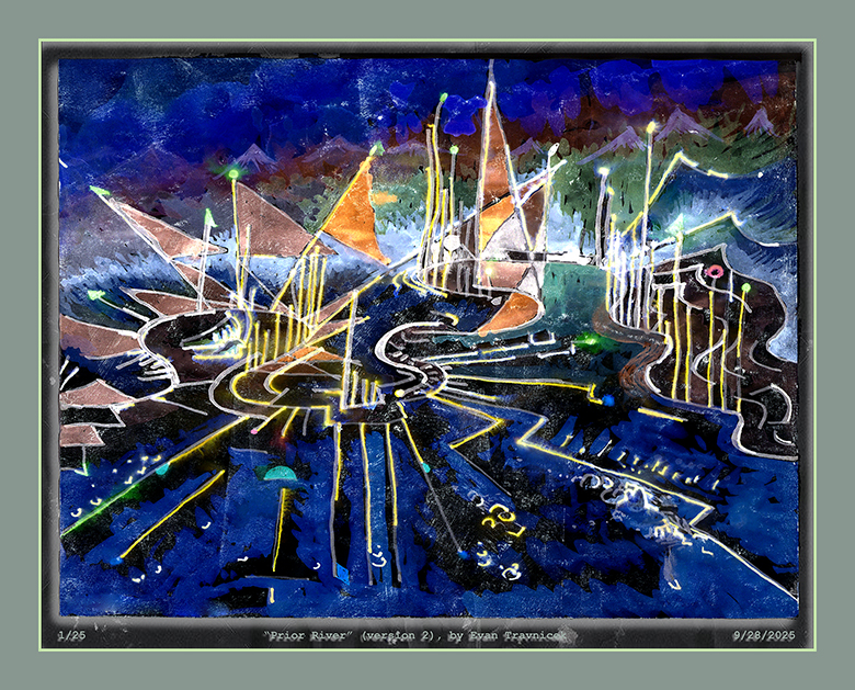 Prior River has connections to a main theme in my dreams. I sometimes dream about walking down to a river from a gradually descending series of river banks. I realized that this theme has connections to my childhood memories of traveling down Dellyne Avenue NW, and Taylor Ranch Drive to go to Albuquerque. The Rio Grande is at the base of descending down the bank on which Taylor Ranch Drive is paved. This part of the city was still rather undeveloped back in the 1980s, so it really was part of the outskirts.