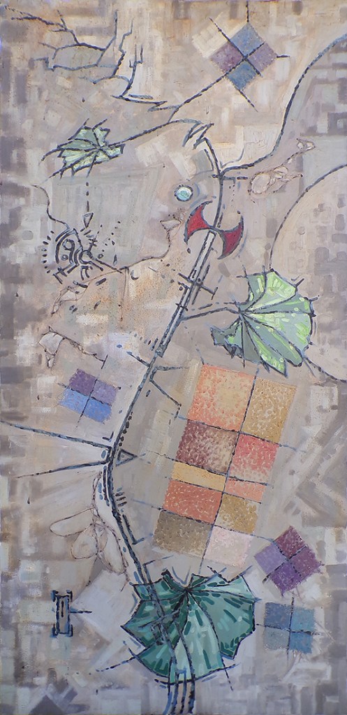 I find one of the most neutral colors one can use for a background to be raw umber mixed with some titanium white. It’s like the middle grey used in traditional photography which reflects about 18% of light that falls on it. The rest of the surface has a gentle absorbing sense about it, including the green colors in the foreground. The nascent forming qualities of the background give a platform on which lines can be defined.