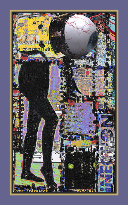 There is an eyeball inserted into a picture of a heavy duty flash-light. The eyeball was an image I obtained off of the internet, while the flashlight is an image I cut out from a magazine and pasted onto a primed piece of cardboard. The woman’s legs were also cut out from a magazine. I’m fulfilling, again, my notion of mosaicism, chimerism, and also hybridization. The idea of hybrid comes in because our culture is in the process of switching over from paper-based means of education, communication, and documentation to electronic means. This conflict manufactured by the societal push into more advanced computerization of human life allows me to use any media I want in order to create all kinds of new and wild ideas.