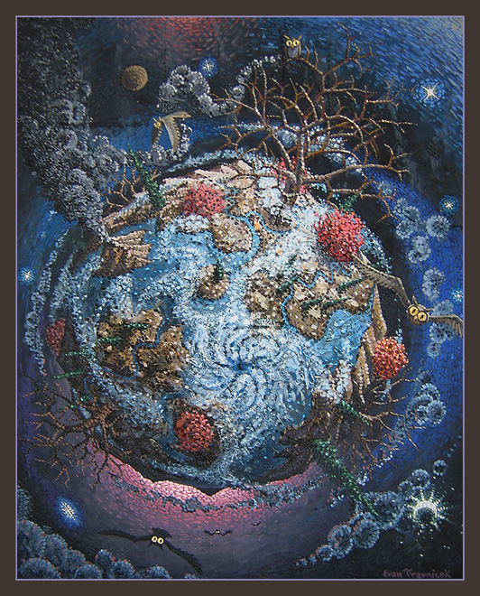 I thought I’d post this painting now since it’s getting near to Halloween 2013. I finished this painting back in 2004. I figured it would be a good painting to show online with my online galleries because it’s sort of a darker theme that has owls flying around in it.