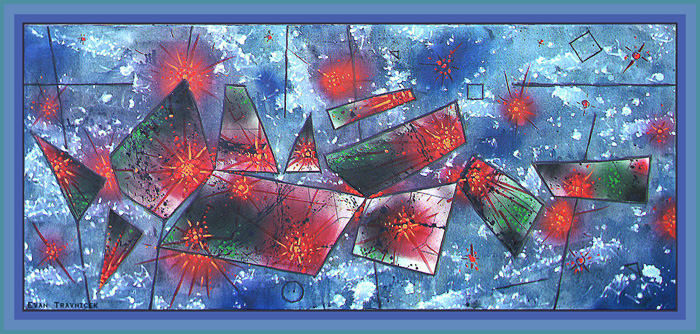 Here is a painting I made in 2003. It involves the usage of strips of canvas, spray paint, charcoal, as well as, both, acrylic and oil paints. This painting represents the beginnings of my experimentation in the usage of multi-mediums. Up to the point when I moved to Nebraska in 2000, I had always been a strict traditional artist in the sense that oil is to be used on canvas and pen and ink on paper.