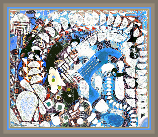 The Big blue shape in the right-center area, along with the four white dashed lines ending in black and white dots, are really the culprits that most remind me of Dali’s early work and Joan Miro’s work. So, while this piece may not be anything new to the art world, it still is a step I find some excitement with in the results of my own art making.