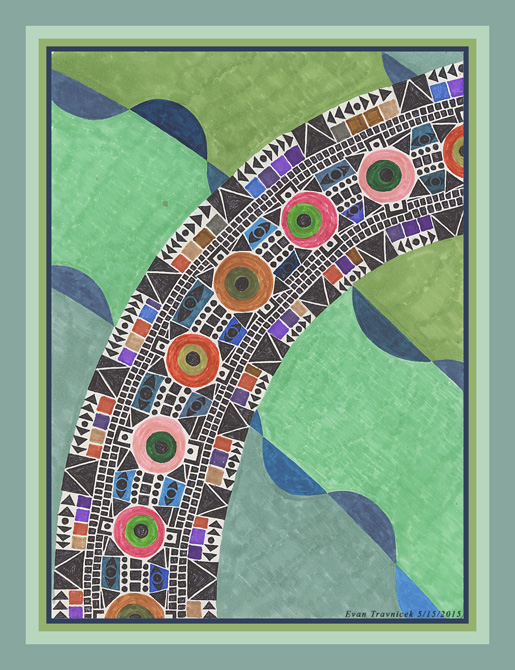 The green and blue swaths and waves that compose the background in this image dominate the eye’s view as you look at it from afar. And when you walk up closer—or zoom in closer—you can see the intricate details of what I call the flexing bow. It is composed of both my usual black ball-point pen mosaic designs, as well as the added color schemed designs.