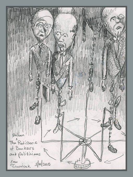I thought of putting a suit around a balloon so that its head expands out from the neck of the suit’s shirt, thus making the suit float from the helium in the balloon. I thought of making several of these suited balloon bankster-politician dolls, and attaching them to a rotisserie type machine that would revolve. This idea would be part of a bigger idea in which they would be displayed in a museum of natural deception, politics, and satire.