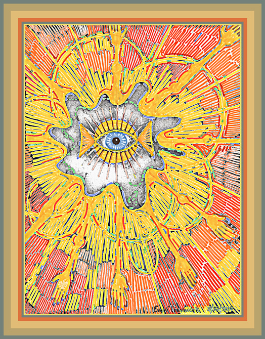 There are many ideas that associate and connect with this drawing. Off the top of my hair follicles, the first one that comes to mind is how it can remind one of the ancient Egyptian gods Aton, Amon, Heliopolis, and Ra; Aton’s rays of light are depicted as hands in reliefs found representing him in various buildings, pyramids, and temples in Egypt. The colors yellow and orange consume most of this picture, with yellow being even more dominant than the orange. Friendship and warmth are obviously associated with sunlight. Eggs are yellow; mustard is yellow; bananas are yellow; and some gold fish are yellow. I made the center of interest with an eye surrounded by a sun-egg-like globe, fish fins coming out of the corners of the eye, and an egg white spreading out, as it does, when cracked open on to a frying pan.