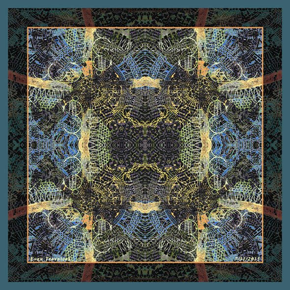 The materials I used to make this design were all derived from original hand drawn mosaics by myself. Primarily, it consists of two drawings—a new one called Without a Third Thought for which you have not seen yet, and another one I made a few years ago called Mandelic Mosaic. The combining of drawings and images from different sources by layering them creates new designs and more complexity. It’s the layering that creates the complexifying, shifting patterns that are so essential to bringing your mind to the edges of imagination.