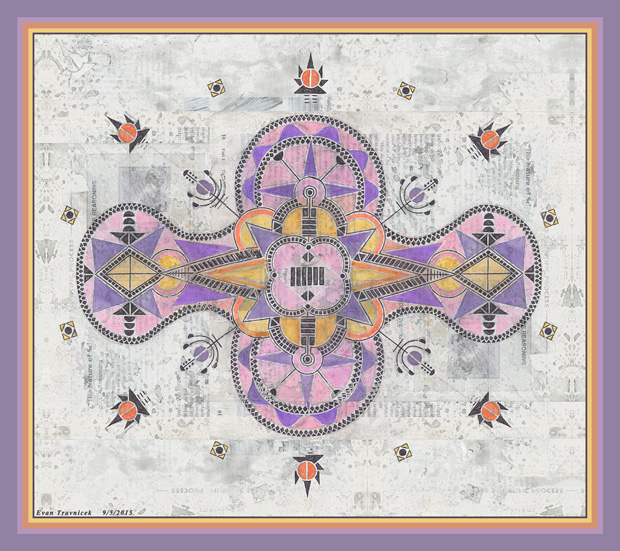 In my searches and explorations, I frequently make drawings and diagrams to give further detail as to what I’m understanding. This is another drawing in that journey. It gives a visual idea of smaller and smaller particles constructing greater and greater wholes; organic, if you will. The objects that manifest in drawings, such as these, are usually permeable—that is, the mosaic bits and pieces render them as lacking solidity, while also suggesting energy and some tension.