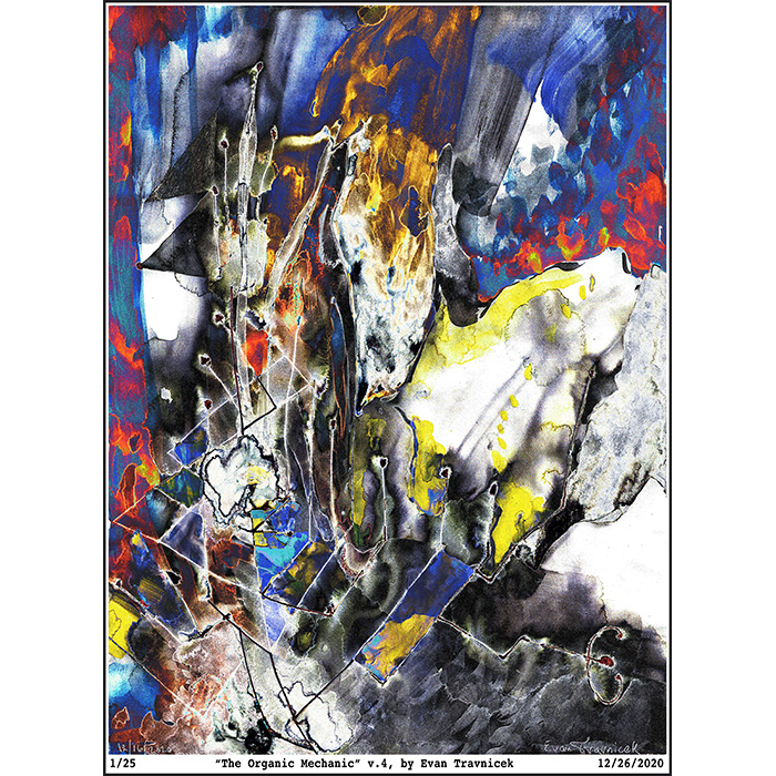 This piece looks like a rather distressed and urgent abstract. I felt satisfied with the results I manipulated in photoshop to seduce out the dramatic and psychedelic qualities laying hidden in the original drawing. I named it The Organic Mechanic because the gradients and color transitions are more organic and natural rather than perfectly pixelated and mathematically calculated. I think our authoritarian social media rulers should take note of this character and remove the unnaturally selective algorithms they have restrained the world with.