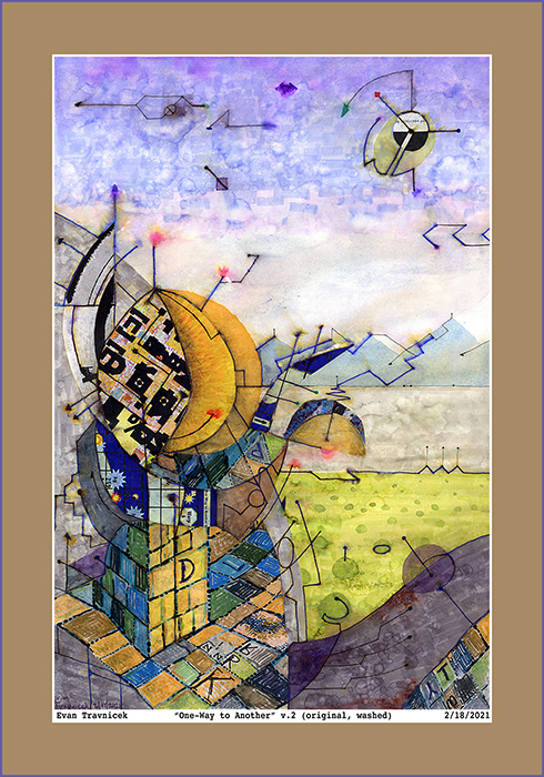 Well, Blunty Wunty is at it again. I had to experiment. Things are coming together more nicely in this piece. My subconscious mind is getting a better grasp on approximating and harmonizing mixed media, such as paper cutouts, watercolor, pro markers, pen & ink, and water & alcohol washes. This style that compels me to continue with it is leading me into interesting spaces and ideas. I’m still not satisfied of my own take on impossible shape-scapes.