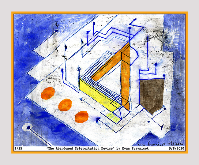 Impossible triangle. You want me to make sense. Here, I don’t have to. I can be a nut, and I can be an artist. I like imagining lands of hypnogogia that lie in between this physical reality we live in and the one next door. Time is more of a mockery in this land, sort of like a surrealist landscape. The lines with arrows and points on the ends of them that I draw as part of my current style of art are symbolic of dimensional angles of space, time, and other dimensions that we don’t normally perceive.